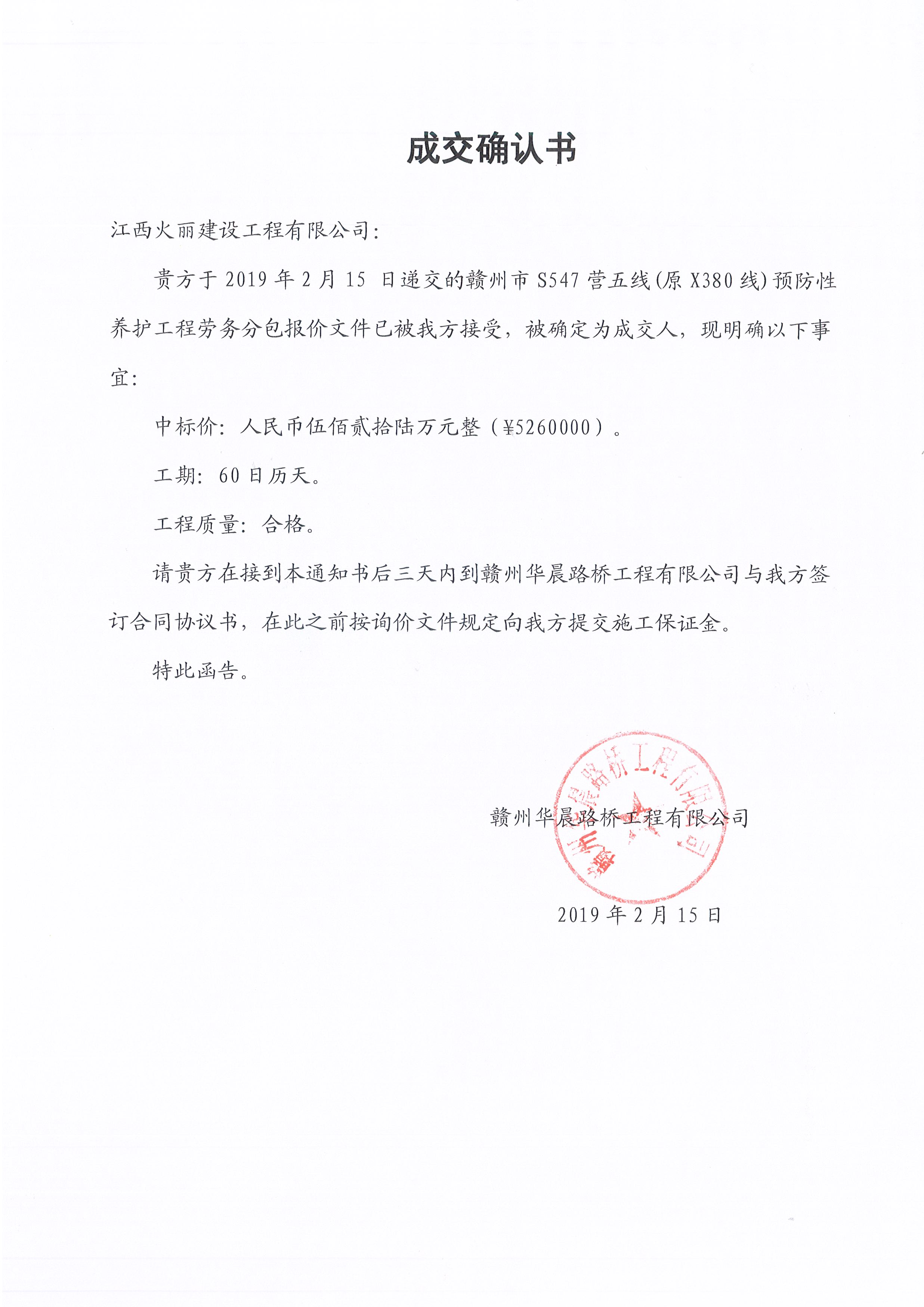 贛州市S547營(yíng)五線(原X380線)預(yù)防性養(yǎng)護(hù)工程勞務(wù)詢價(jià)成交確認(rèn)書