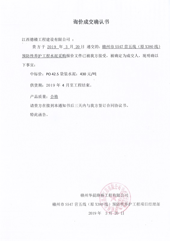 贛州市S547營五線(原X380線)預防性養(yǎng)護工程水泥采購詢價成交確認書