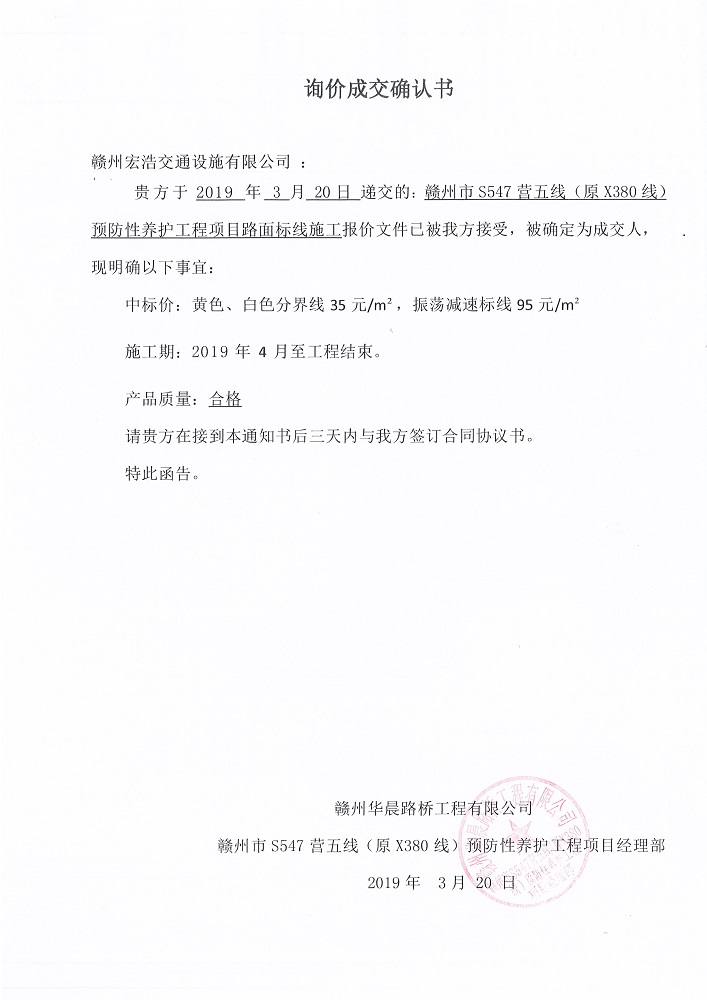 贛州市S547營五線(原X380線)預(yù)防性養(yǎng)護(hù)工程項(xiàng)目路面標(biāo)線施工詢價(jià)成交確認(rèn)書