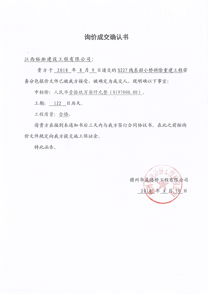 S227線東韶小橋拆除重建工程勞務(wù)詢價成交確認(rèn)書