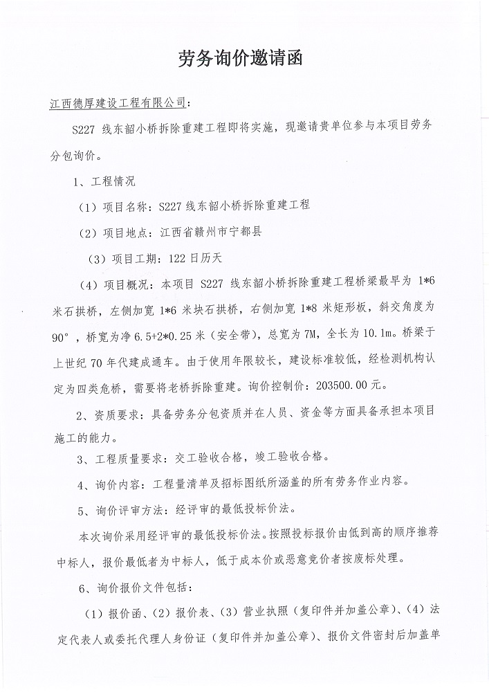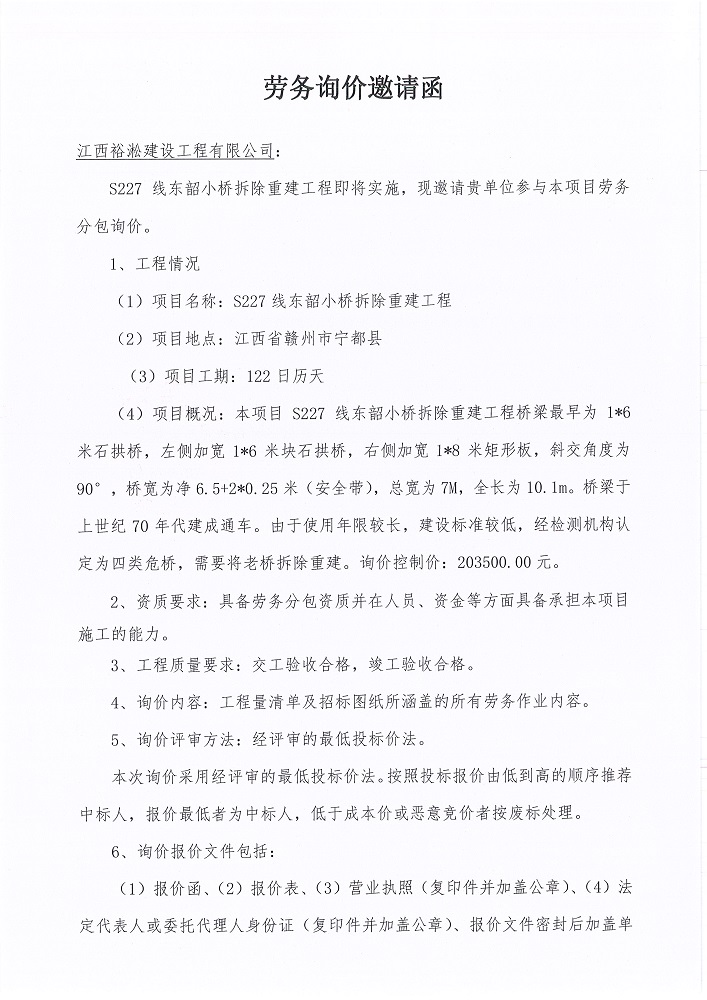 S227線東韶小橋拆除重建工程勞務(wù)詢價(jià)邀請函