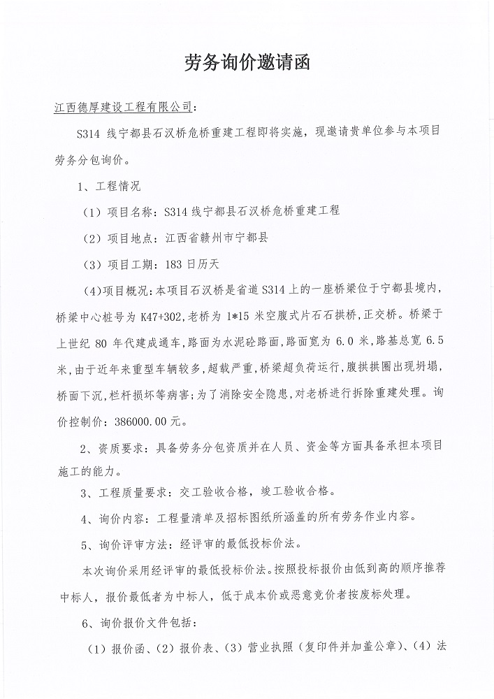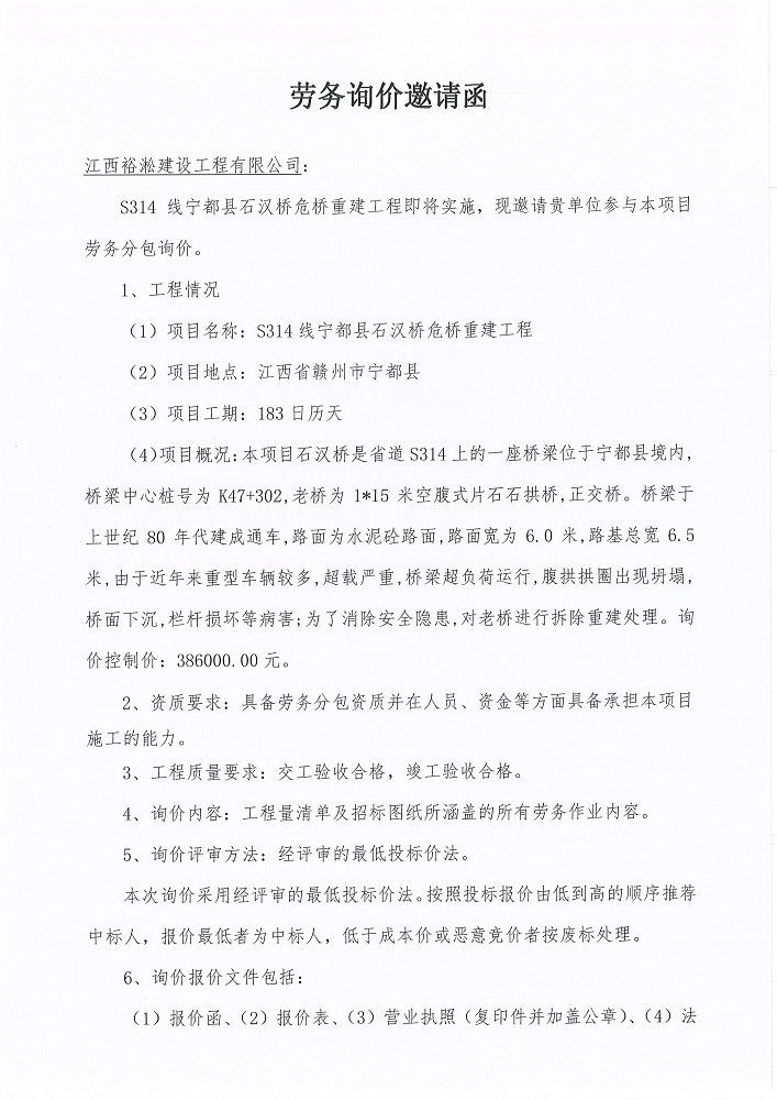 S314線寧都縣石漢橋危橋重建工程勞務(wù)詢價邀請函