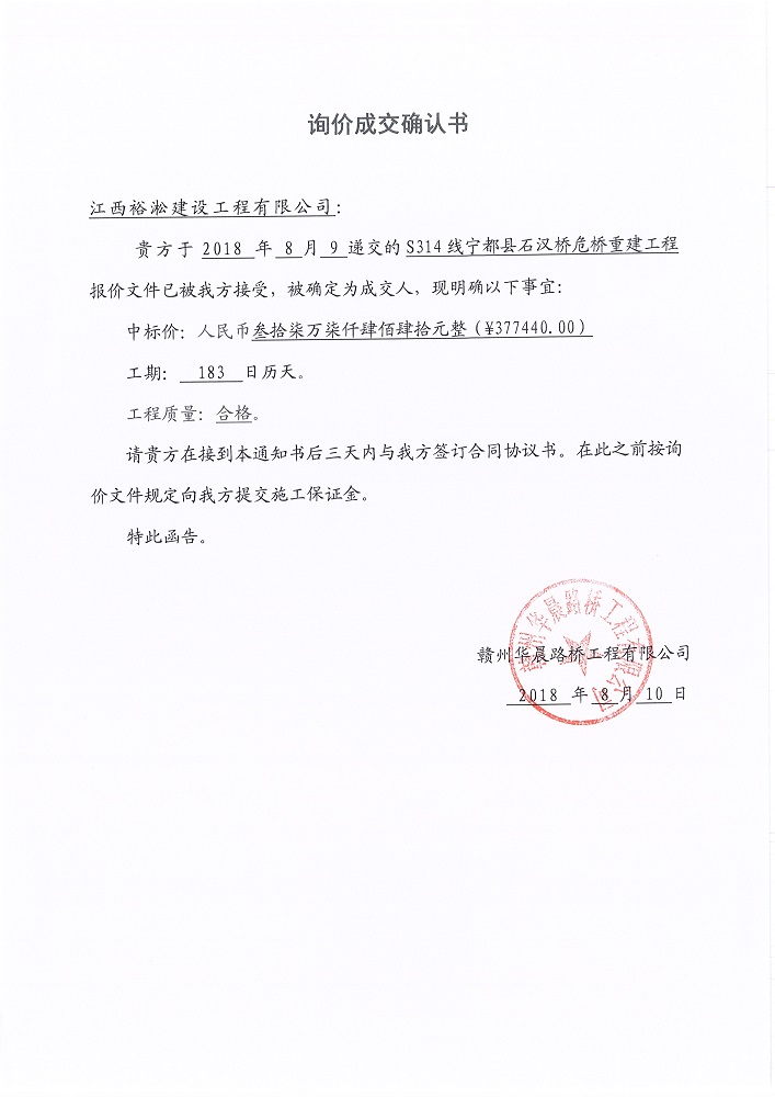 S314線寧都縣石漢橋危橋重建工程勞務(wù)詢價(jià)確認(rèn)書